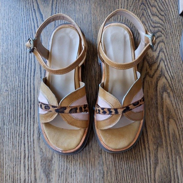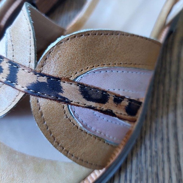 SANDALIA EN CUERO VACUNO SUELA CON DETALLES EN CUERO ROSA Y PRINT.LA BASE ES DE EXPANSO CON VIRA Y EL TACO FORRADO EN FOLIA.